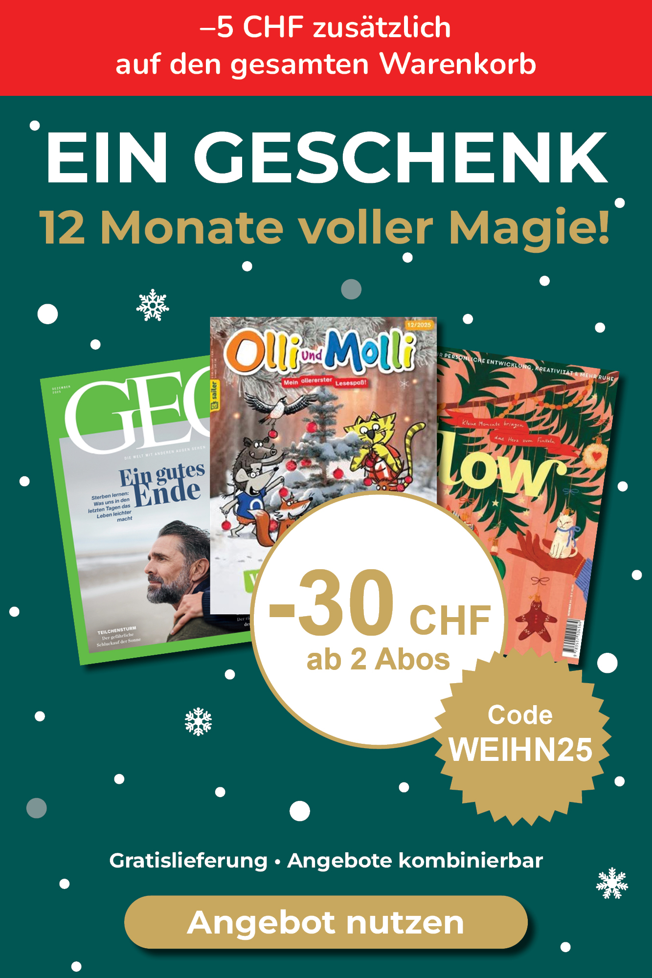 bis zu-25%Dauer: ½-Jahresabo CHF40.00CHF48.00Kioskpreiserscheint 8 Ausgaben pro Jahr 2 Versionen